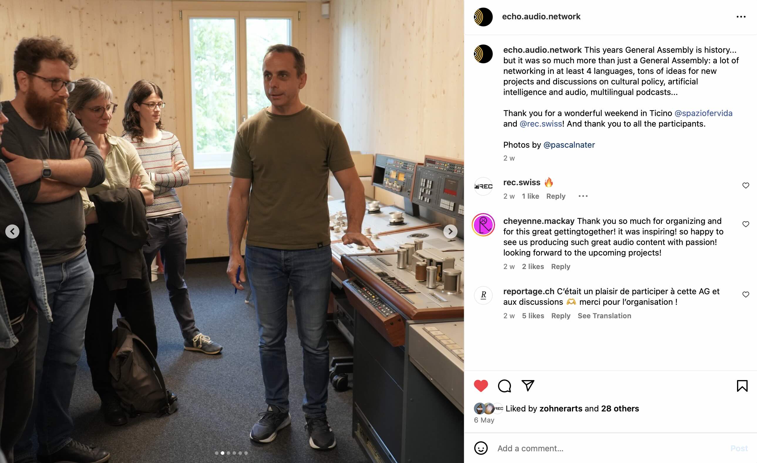 Durante l’assemblea è stato dedicato anche del tempo alla visita alla Fonoteca Nazionale a Lugano e alle discussioni tra creatori, tecnici e produttori radiofonici. Sono state molte le tematiche trattate e sicuramente l’esistenza di eCHo è necessaria per trovare nuovi modi di creare produzioni plurilingue, aumentare la visibilità dei contenuti radiofonici indipendenti di alta qualità e soprattutto di rivedere i finanziamenti dedicati a questo settore culturale.