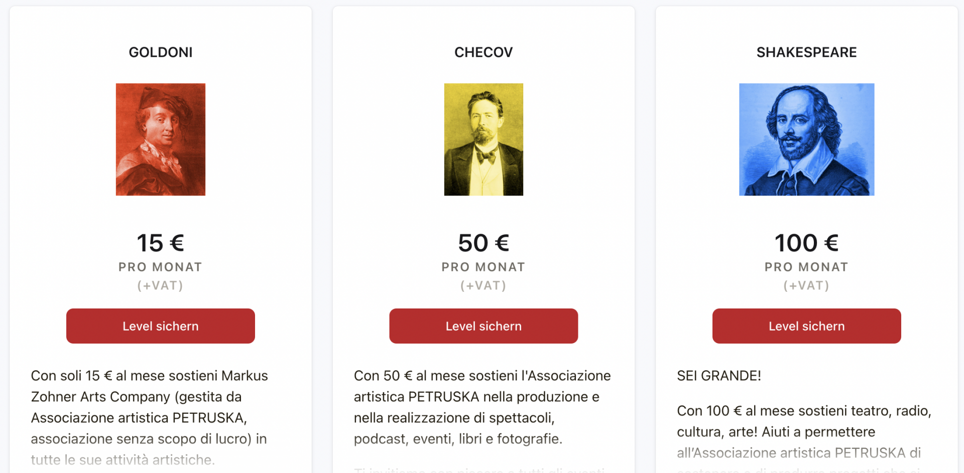 Il tuo sostegno và all’ Associazione artistica PETRUSKA, associazione svizzera senza scopo di lucro, riconosciuta dalle autorità fiscali del Canton Ticino / Svizzera. Per questo la tua donazione è esente di tasse, e la potrai dedurre dalle entrate nella prossima dichiarazione fiscale.